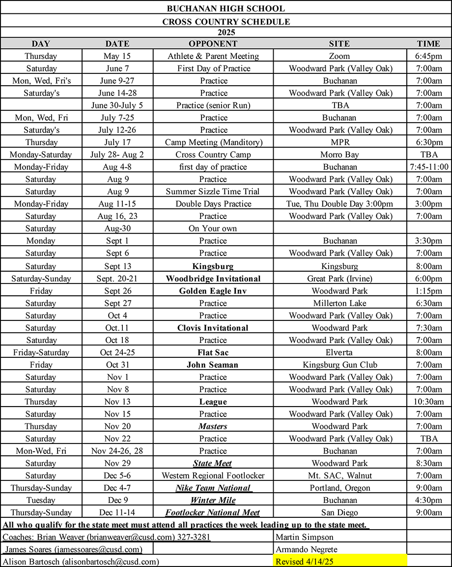 Buchanan XC Schedule
